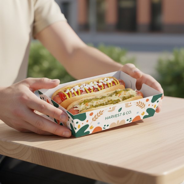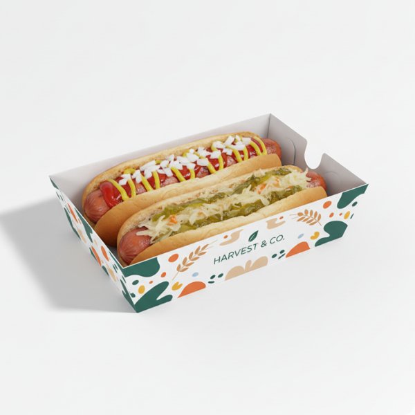 Custom Recyclable Reusable Hot Dog Fast Food Takeaway Packaging Tray Box with Matt Lamination Embossing